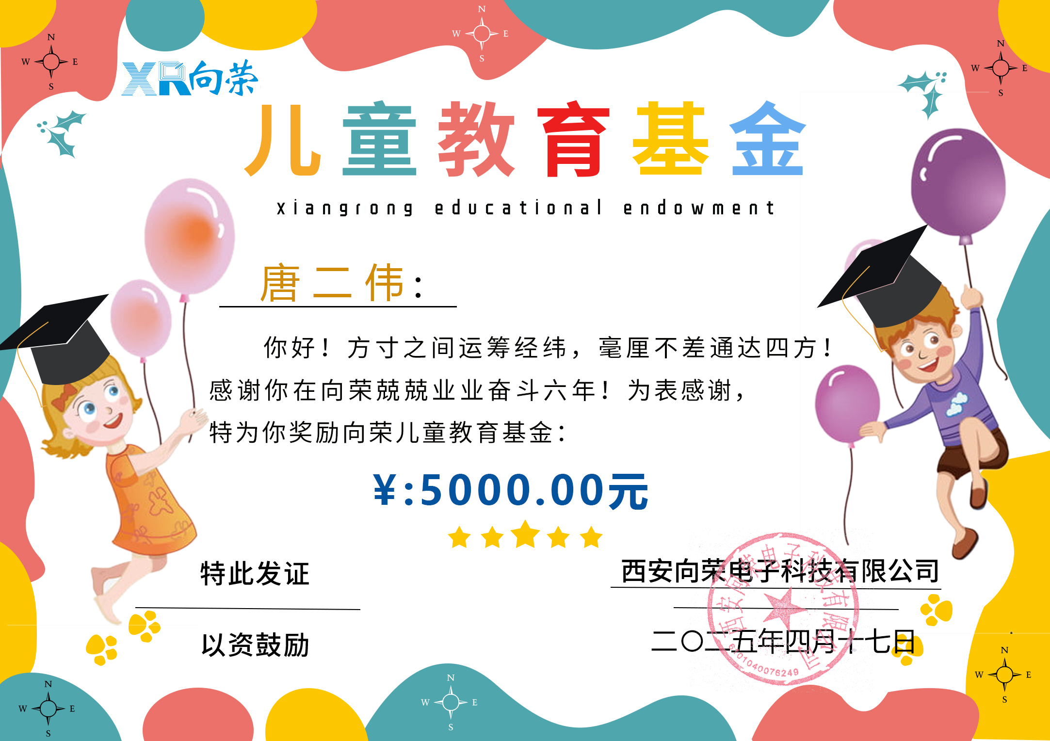 恭喜唐二伟同学,获得5000元向荣儿童教育基金