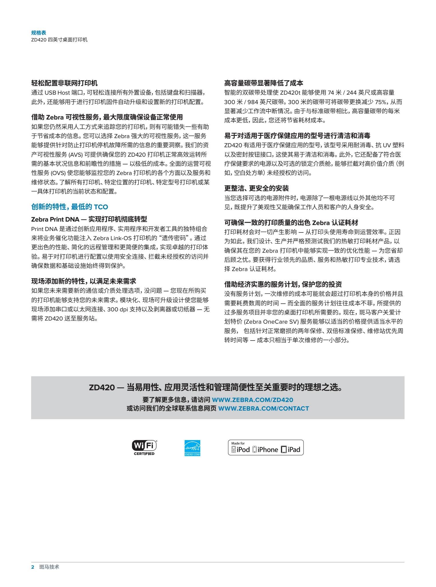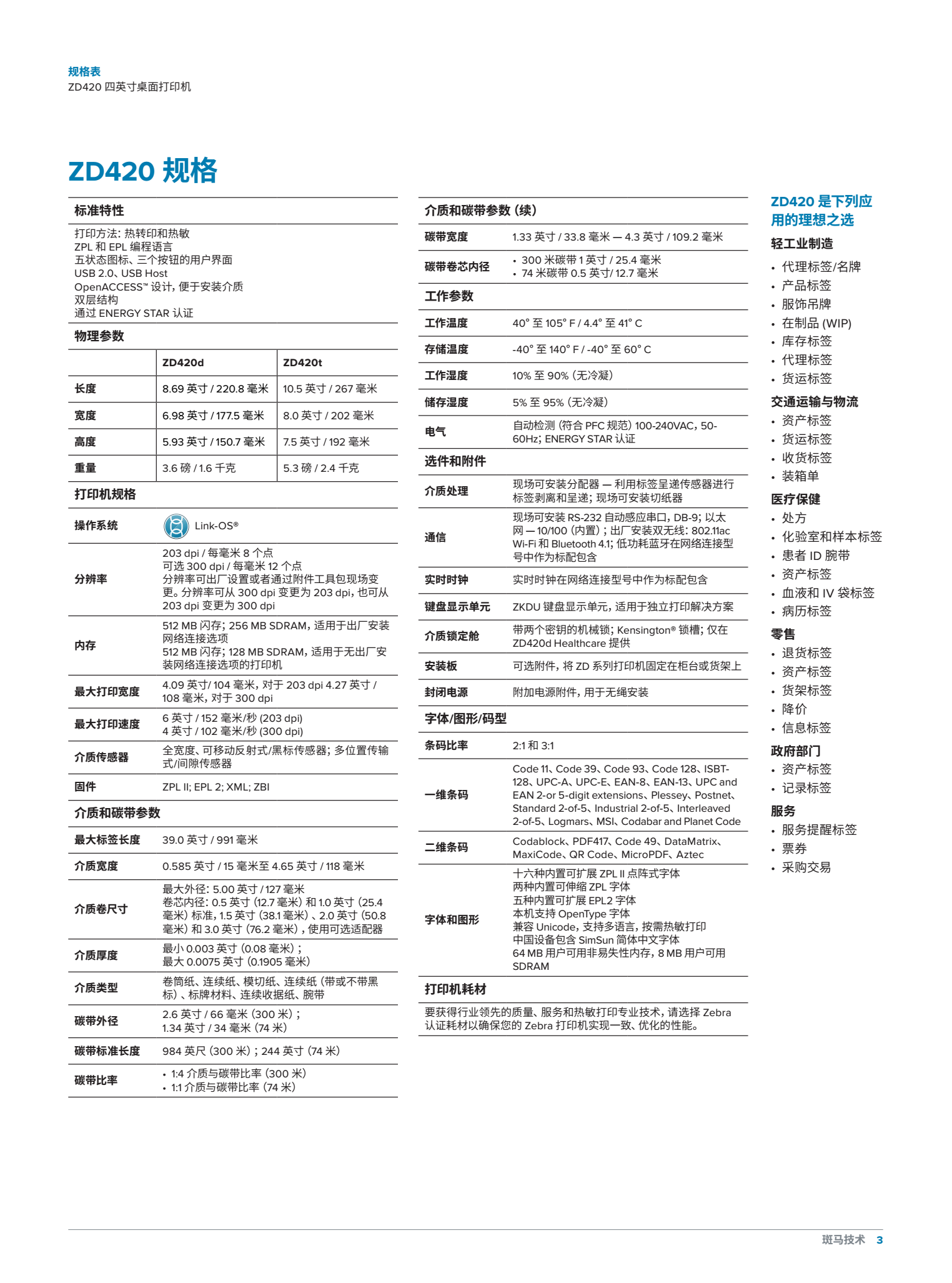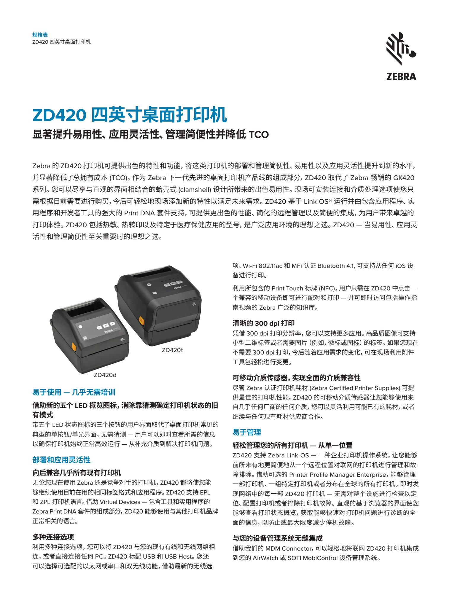 将易用性、应用灵活性和管理简便性提升到全新的水平。若您需要易于使用、部署和管理的 4 英寸快捷热敏打印机,则可选择 ZD420。ZD420 系列打印机基于行业先进的传统 GK 系列打印机而设计,其特性和功能可带来全新水平的部署和管理简便性。ZD420 不仅打印速度更快,打印质量更佳,使业务保持顺利运行,且提供应用灵活性以及较低的总体拥有成本 (TCO)。