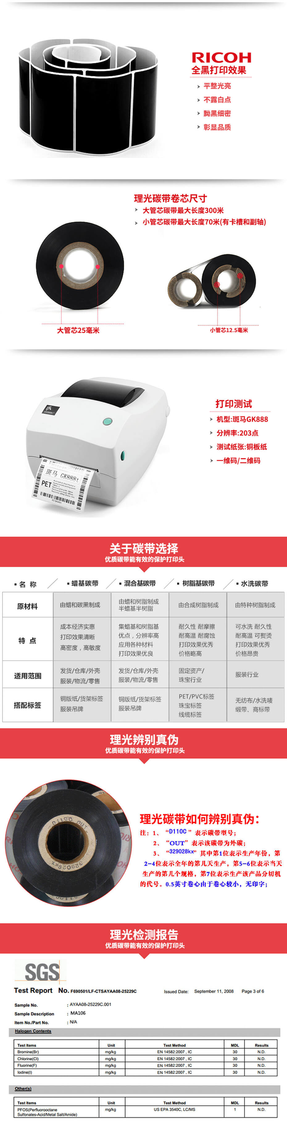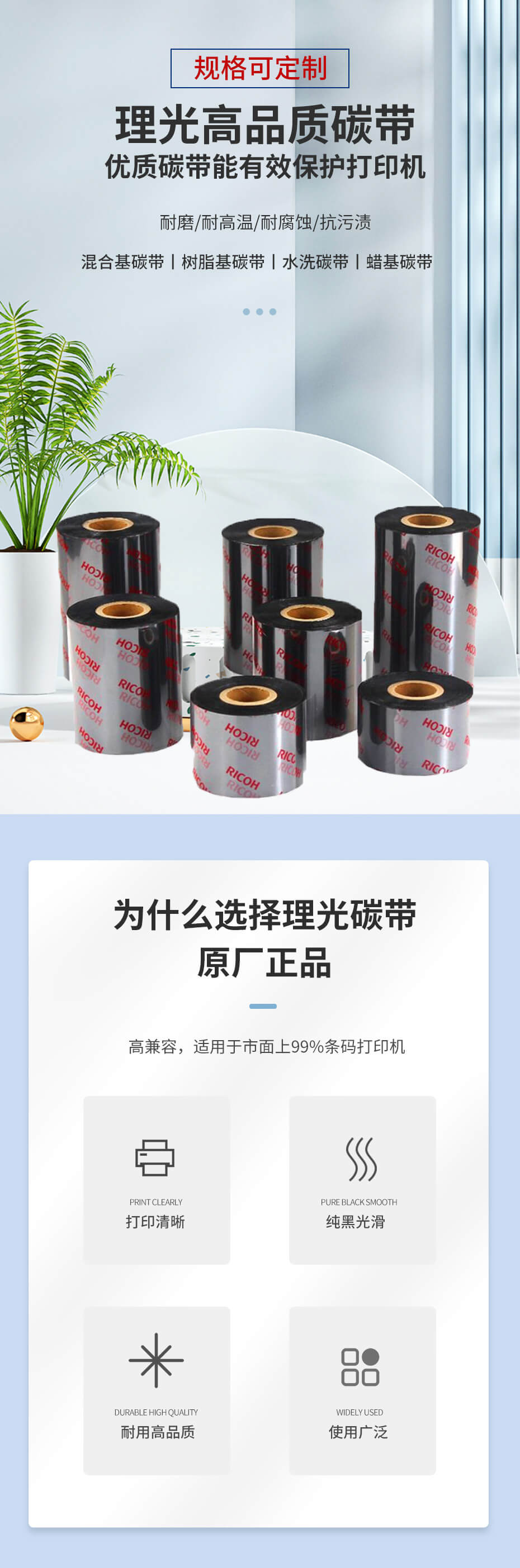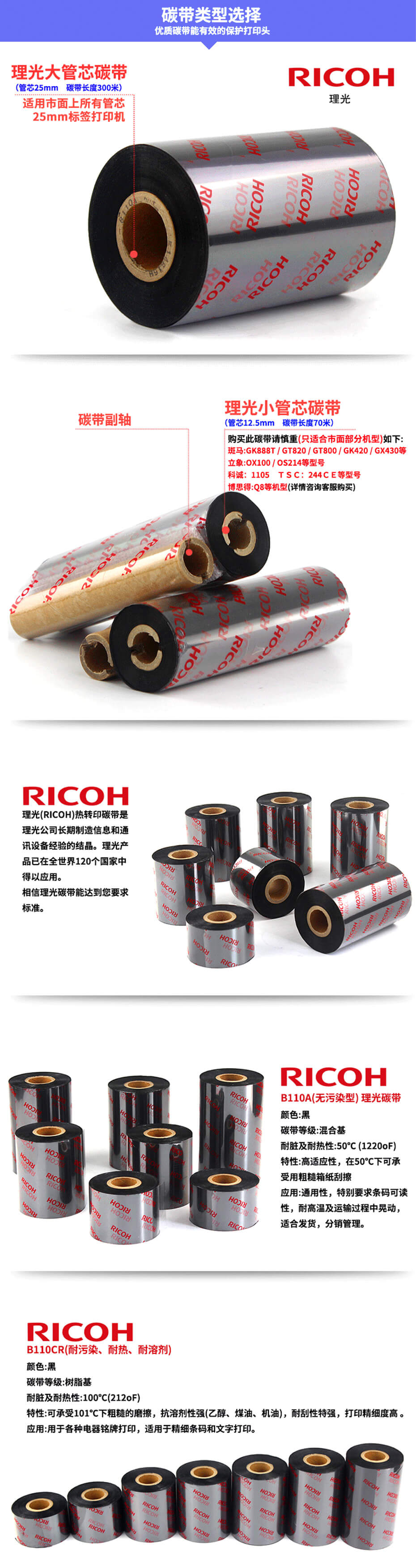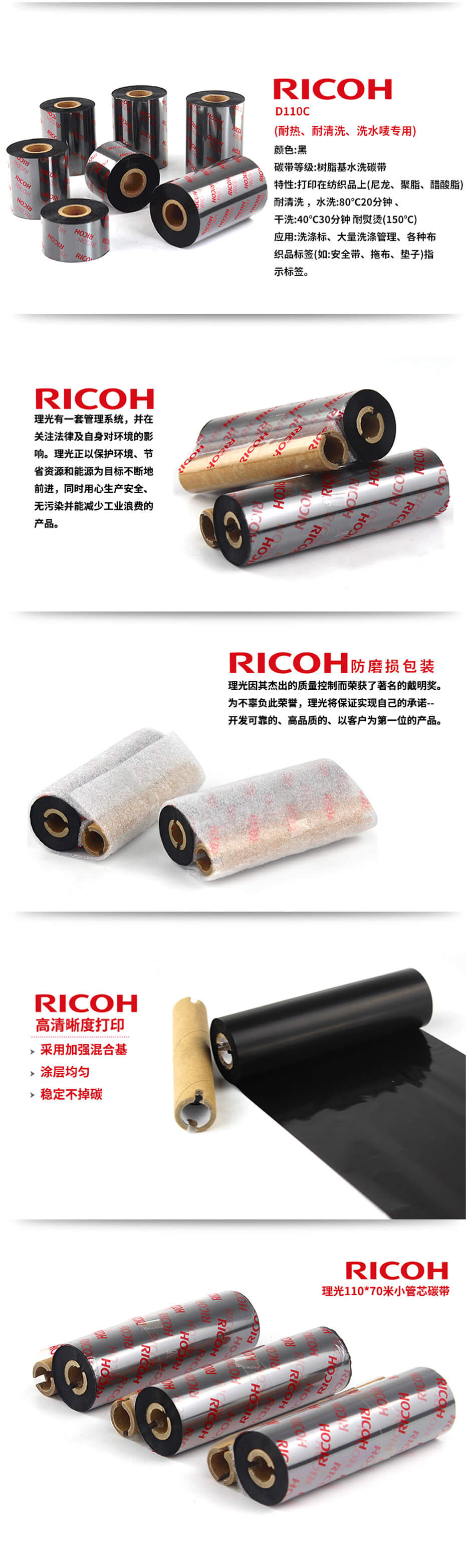 产品简介: 理光碳带根据不同使用需求,有耐热耐污染耐溶剂耐清洗等特点,规格可定制。